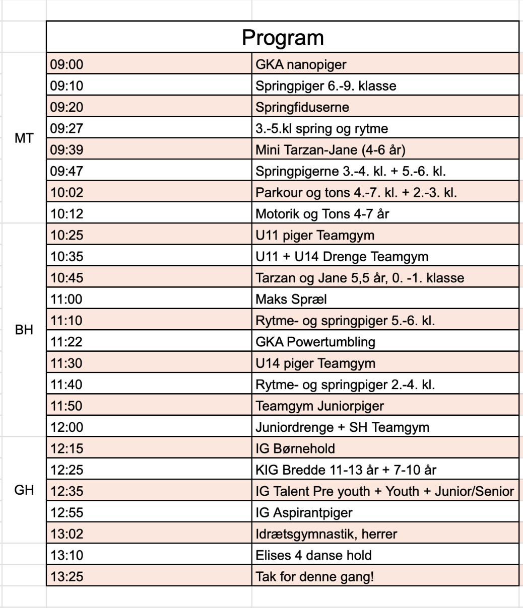Alle tre haller tages i brug, og hele programmet kan ses herunder. MT = Motorikhallen, BH= Bevægelseshallen og GH= Gymnastikhallen.